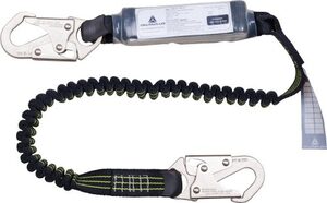 Eslinga con absorbedor de energía de reata elástica tubular. Hebillas con guardacabos. Equipado con 2 mosquetones de 20mm de apertura.
